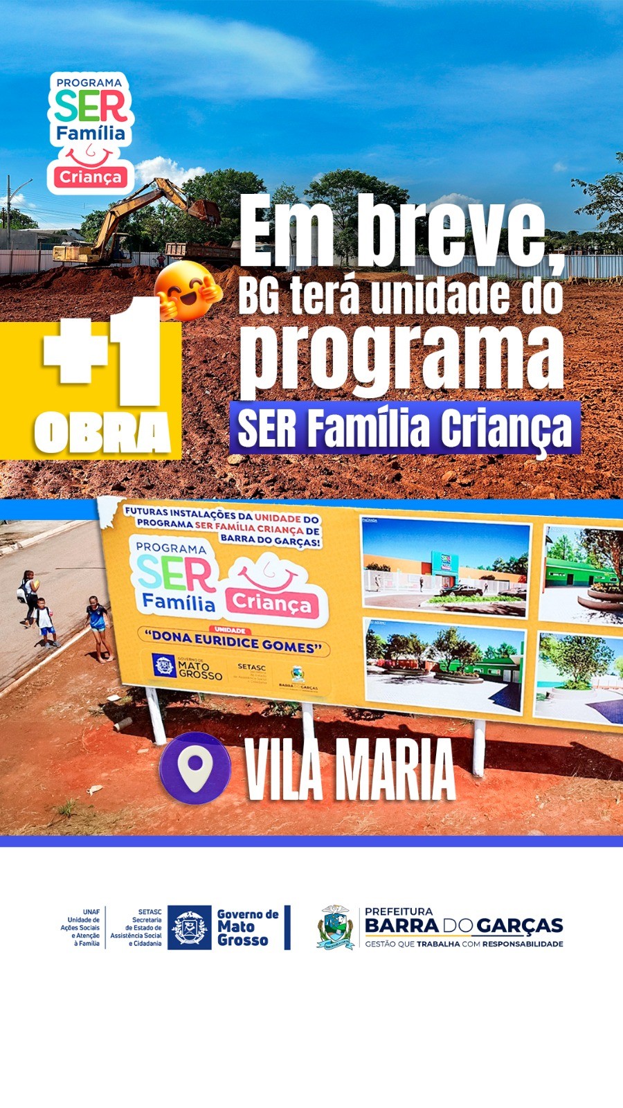 Recentemente, foram iniciados os trabalhos de terraplanagem para a construção do centro de assistência infantil Dona Euridice Gomes, no bairro Vila Maria, em Barra do Garças. A obra, que faz parte do programa SER Família Criança, é fruto de um convênio celebrado entre a Prefeitura Municipal e o Governo de Mato Grosso, com investimento de R$ 5.482.876,06.