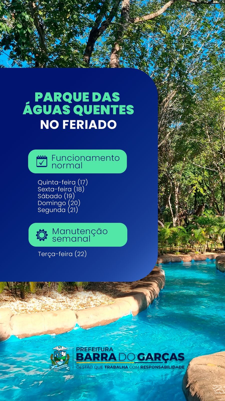 O parque, um dos principais cartões-postais de Barra do Garças, abrirá suas portas para o público durante os feriados, oferecendo lazer e diversão. Contudo, no dia 22 de abril, o Parque Municipal das Águas Quentes estará fechado para manutenção, retornando o atendimento normalmente na quarta-feira (23/4).