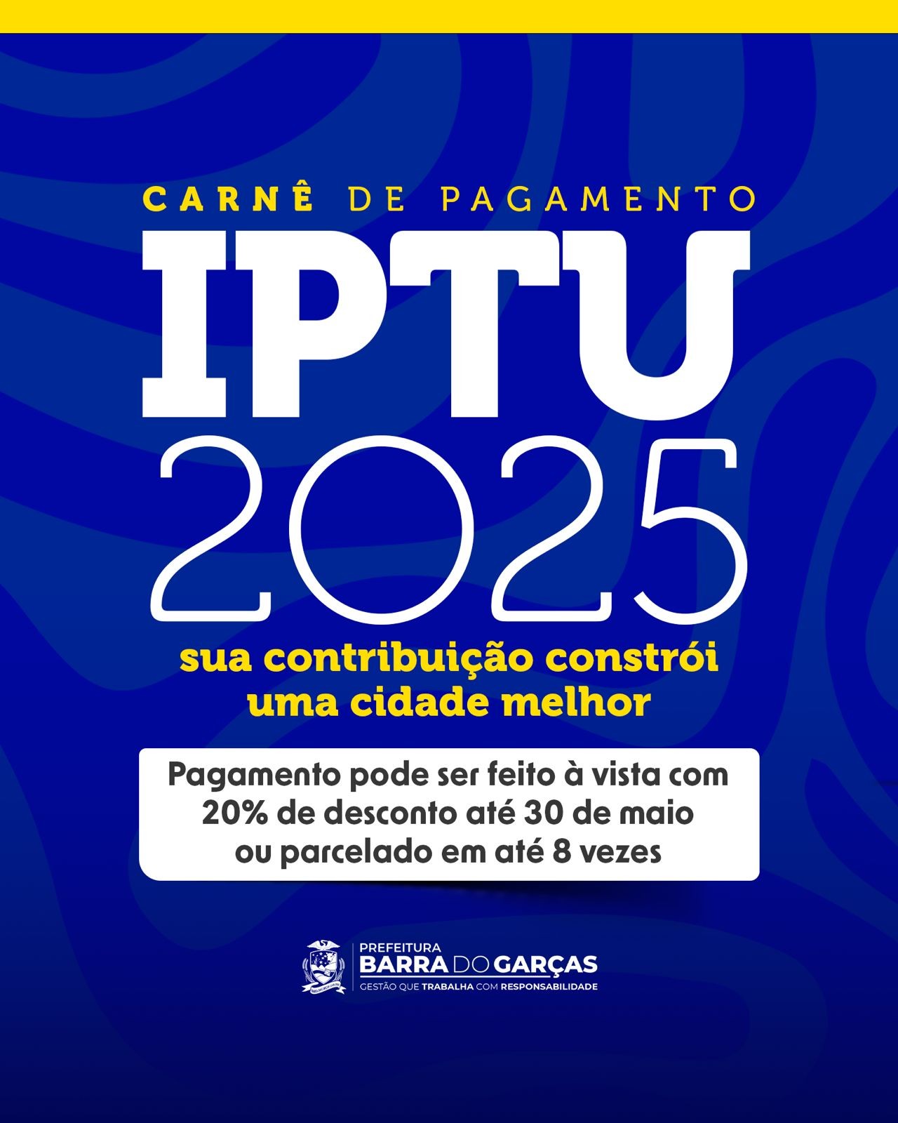 A Prefeitura de Barra do Garças, por meio da Secretaria Municipal de Planejamento e Finanças, reforça que o prazo para pagamento da cota única do IPTU 2025 com 20% de desconto termina amanhã, sexta-feira, dia 30 de maio. A guia pode ser emitida pelos canais oficiais da Prefeitura.
