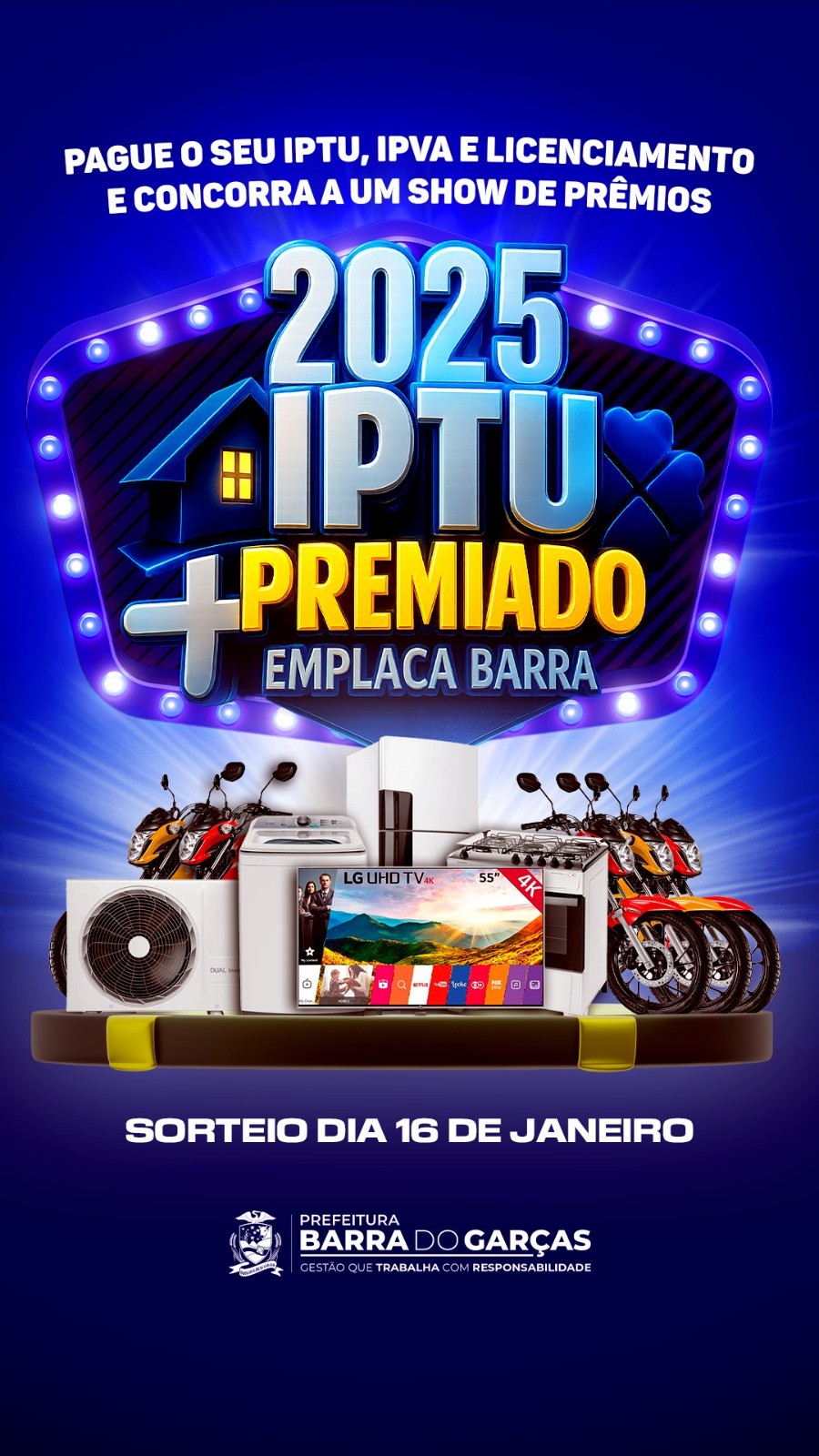 A Prefeitura de Barra do Garças, através da Secretaria de Planejamento e Finanças, comunica que os cupons de sorteio da campanha “IPTU Premiado e Emplaca Barra” já estão disponíveis para retirada. Desta vez, serão sorteados dez super prêmios: 05 (cinco) motos 160 cilindradas; 01 (uma) geladeira de 410 litros; 01 (um) fogão de cinco bocas; 01 (uma) máquina de lavar roupas de 12 kg; 01 (uma) TV 55 polegadas; e 01 (um) ar condicionado de 12 mil btus.