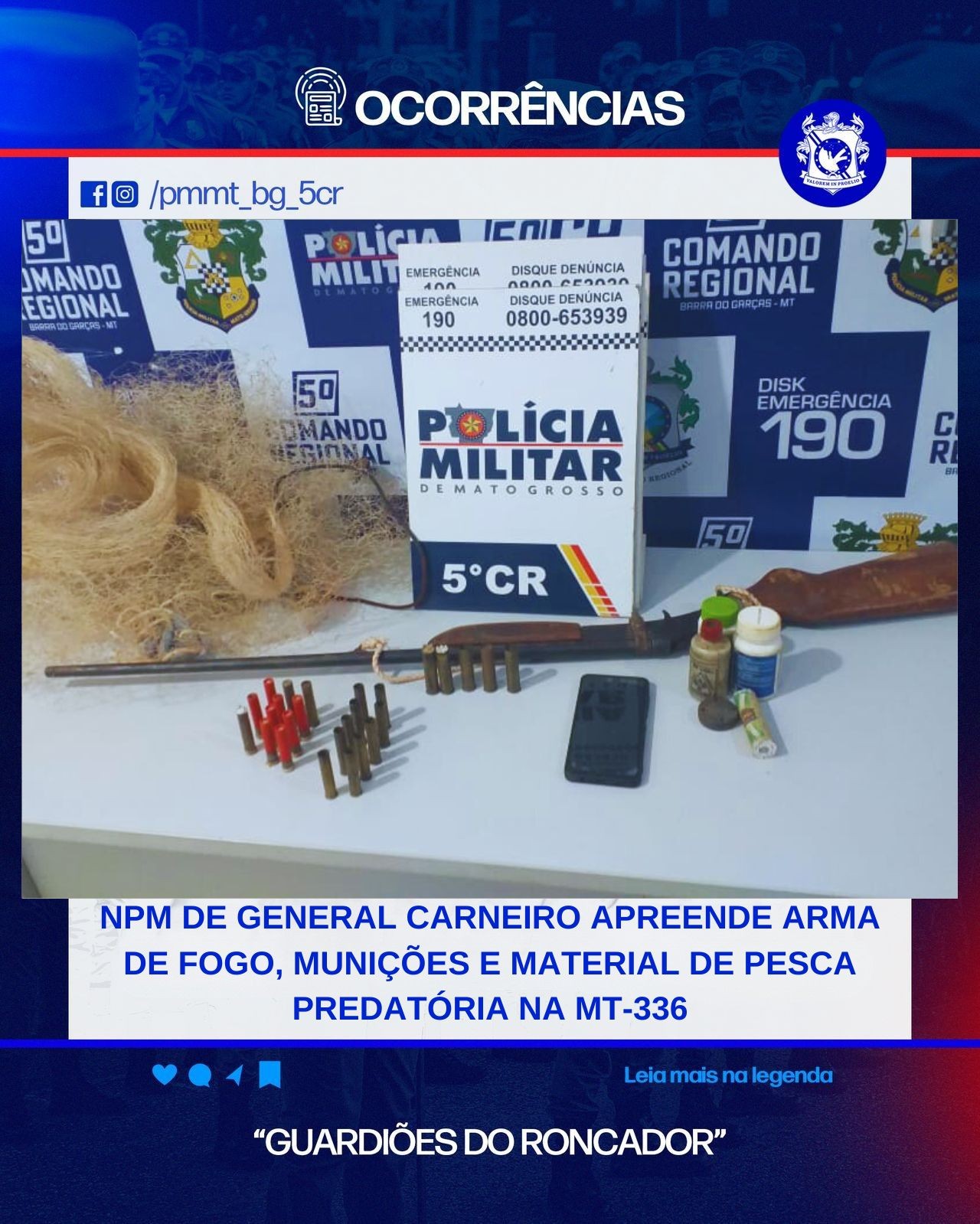Na tarde dessa quarta-feira (03), a Polícia Militar por meio NPM de General Carneiro realizou um bloqueio policial na MT-336 que resultou na apreensão de uma arma de fogo, munições e materiais de pesca predatória.