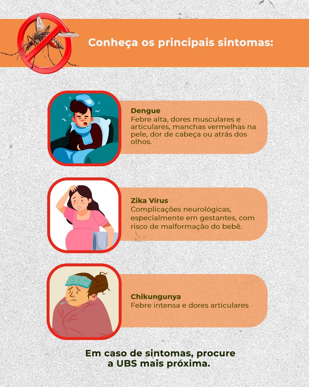 Dentre os sintomas de Dengue, pode-se observar: febre alta, dores musculares e articulares, manchas vermelhas na pele, dor de cabeça ou atrás dos olhos. O Zika Vírus é outra preocupação, pois pode causar complicações neurológicas, especialmente em gestantes, com risco de malformação do bebê. Já a Chikungunya é marcada por febre intensa e dores articulares.