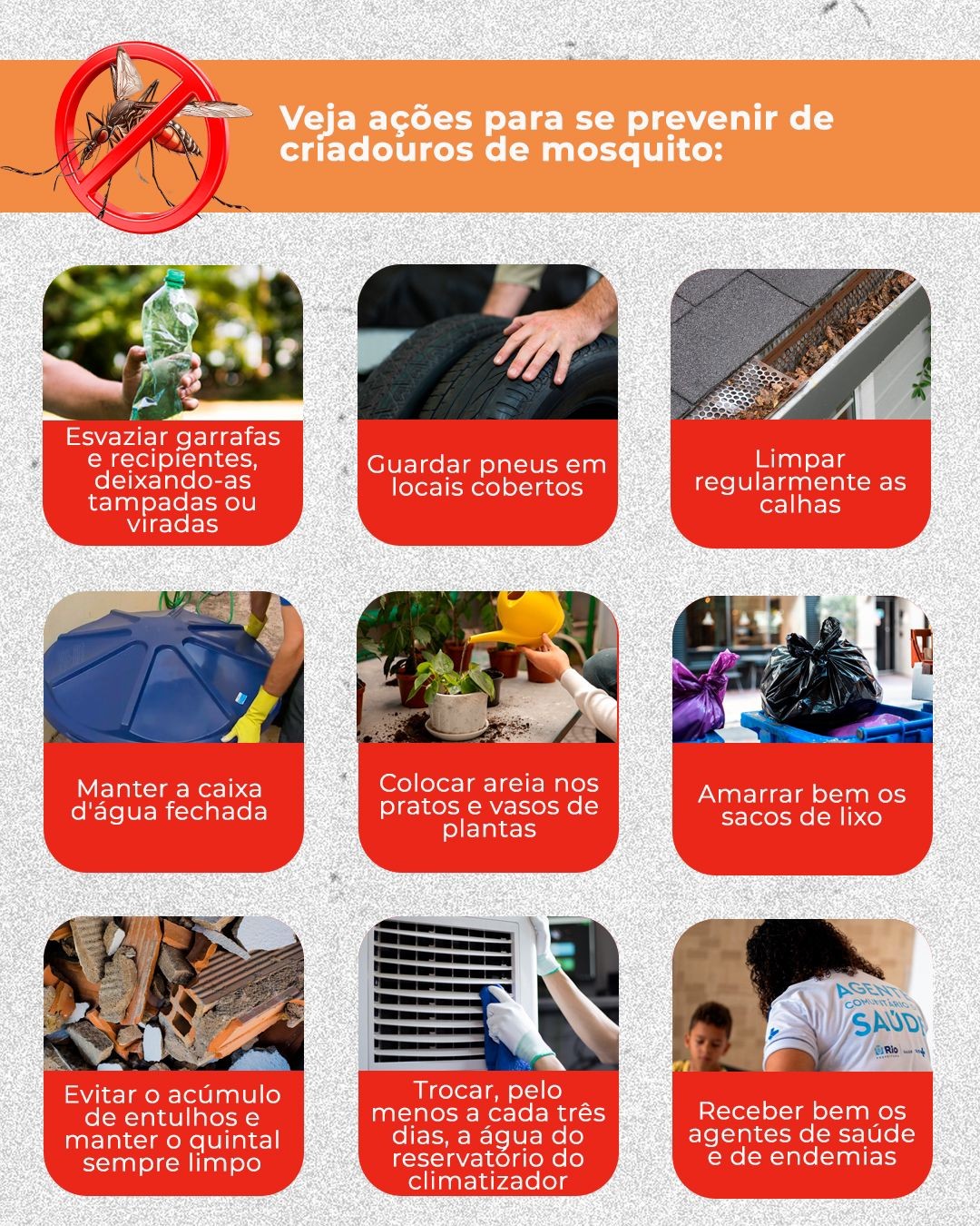Vale ressaltar que o município conta com a ajuda dos Agentes de Combate às Endemias, que realizam visitas em residências, comércios e lotes baldios, identificando e eliminando objetos que acumulam água, e também dos Agentes Comunitários de Saúde, que visitam e orientam a população sobre os sintomas, os riscos e as medidas de prevenção de doenças.