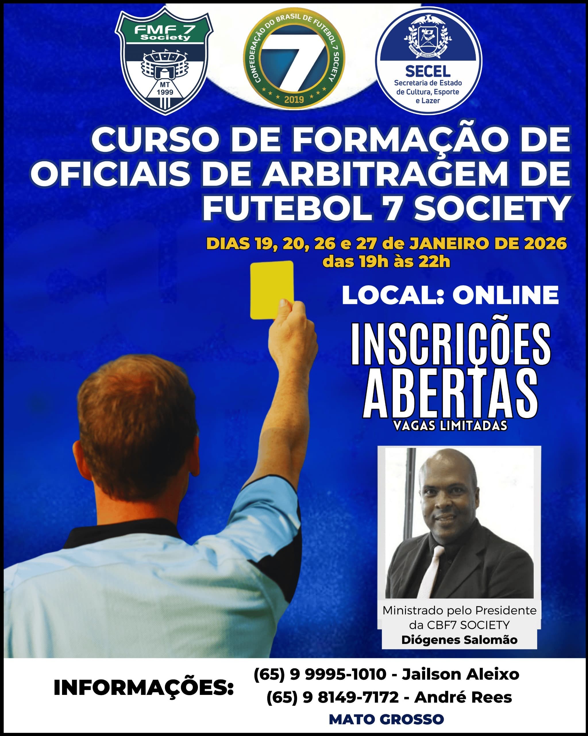 A Federação Matogrossense de Futebol 7 Society (FMF 7 Society) , em parceria com a Confederação do Brasil de Futebol 7 Society (CBF7 Society) e com apoio da Secretaria de Estado de Cultura, Esporte e Lazer de Mato Grosso (SECEL-MT) , abriu oficialmente as inscrições para o Curso de Formação de Oficiais de Arbitragem de Futebol 7 Society.