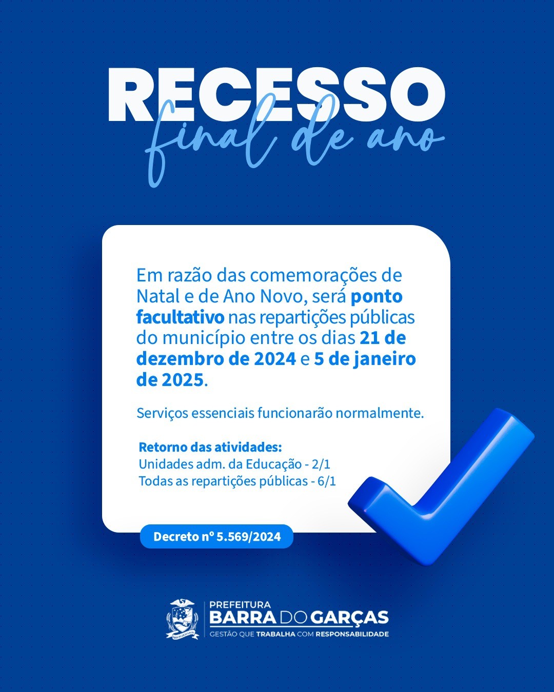Em razão das comemorações de Natal e de Ano Novo, a Prefeitura de Barra do Garças decretou ponto facultativo nas repartições públicas do município, entre os dias 21 de dezembro de 2024 a 5 de janeiro de 2025.