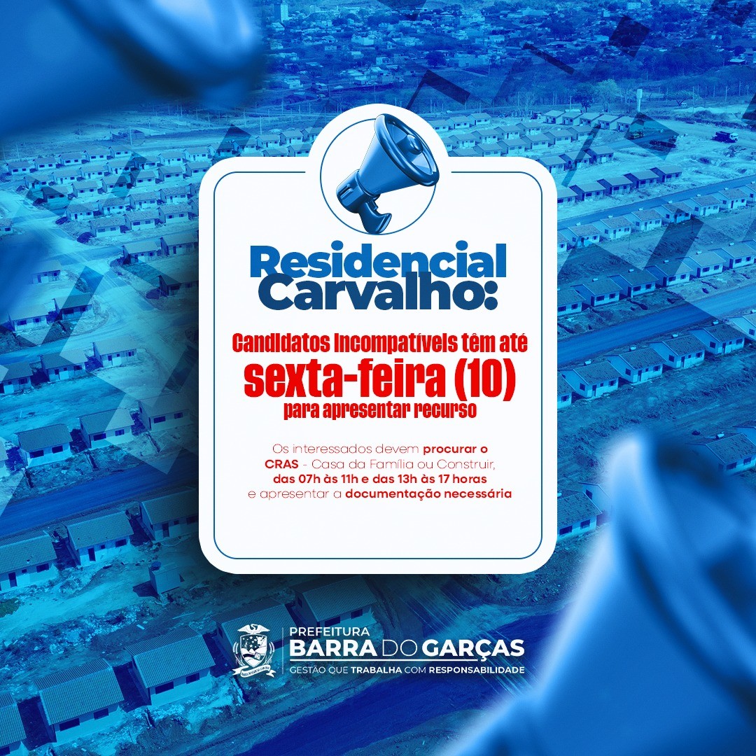 Os titulares inscritos no programa “Minha Casa, Minha Vida”, do Governo Federal, que não atendem aos requisitos para serem contemplados com as casas do Residencial Carvalho I, II e III, podem apresentar o recurso, para comprovarem sua elegibilidade para o benefício, até esta sexta-feira (10). A Prefeitura de Barra do Garças, por meio da Secretaria Municipal de Assistência Social, publicou a lista dos candidatos incompatíveis no último mês.