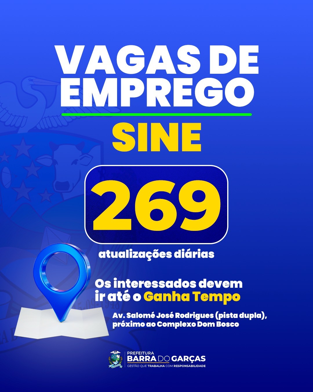 As vagas de emprego ofertadas pelo Sine são atualizadas diariamente e podem ser consultadas no site oficial da Prefeitura de Barra do Garças.