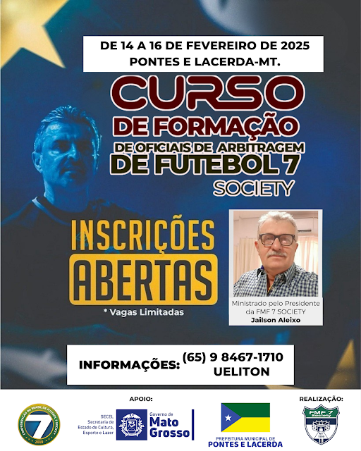 O tão esperado Curso de Arbitragem de Futebol 7 Society chega a Pontes e Lacerda, uma grande oportunidade para quem deseja se capacitar ou aperfeiçoar seus conhecimentos na arbitragem deste esporte dinâmico e emocionante.