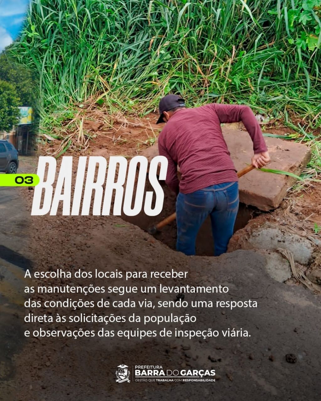 A Prefeitura de Barra do Garças, por meio da Secretaria Municipal de Infraestrutura e Serviços, está realizando manutenções emergenciais nas vias de alguns bairros do município. Os trabalhos consistem em serviço de tapa-buracos e limpeza de bueiros, buscando manter a trafegabilidade e prevenir alagamentos.