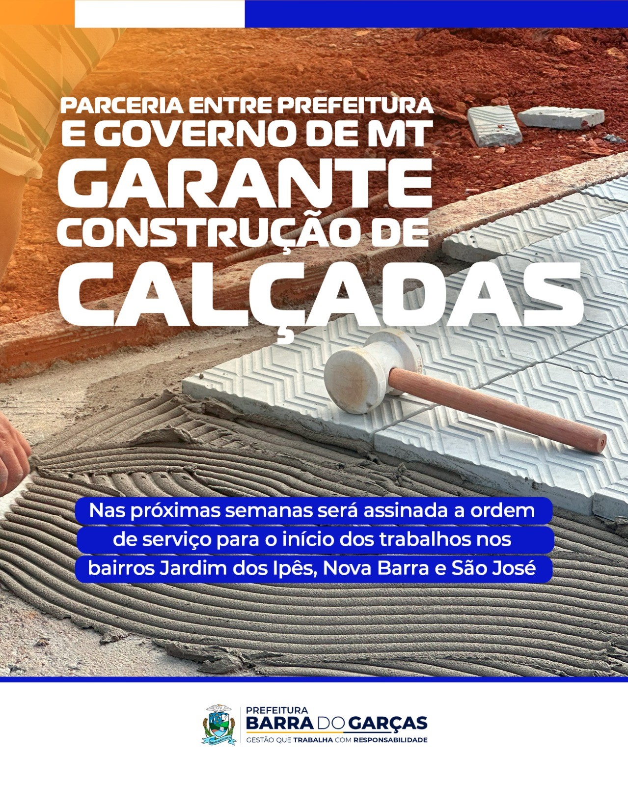 A Prefeitura de Barra do Garças, em parceria com o Governo do Estado de Mato Grosso, vai investir mais de quatro milhões de reais na construção de calçadas nos bairros Jardim dos Ipês, Nova Barra e São José. A ordem de serviço para o início dos trabalhos deste importante projeto, que busca trazer melhorias significativas para a infraestrutura urbana, será assinada nas próximas semanas.