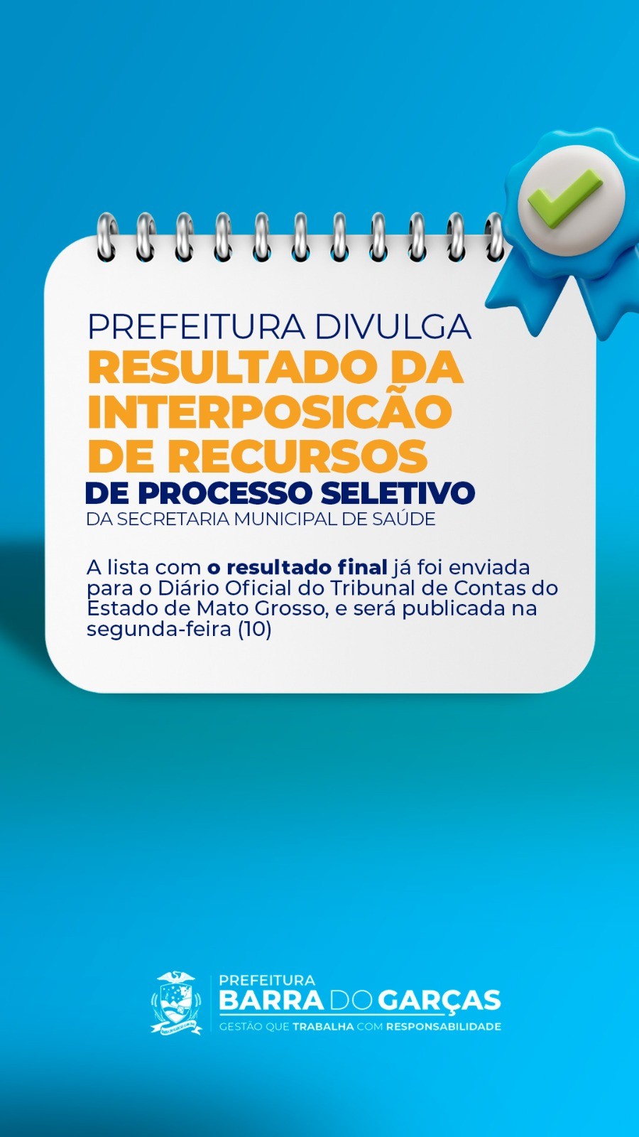 Nesta sexta-feira (7), a Prefeitura de Barra do Garças, através da Secretaria Municipal de Saúde, divulgou o resultado do recurso do processo seletivo simplificado para a contratação de profissionais em regime temporário; a lista já pode ser conferida. Vale mencionar que o resultado final já foi enviado para o Diário Oficial do Tribunal de Contas do Estado de Mato Grosso (TCE-MT), e será publicado na segunda-feira (10).