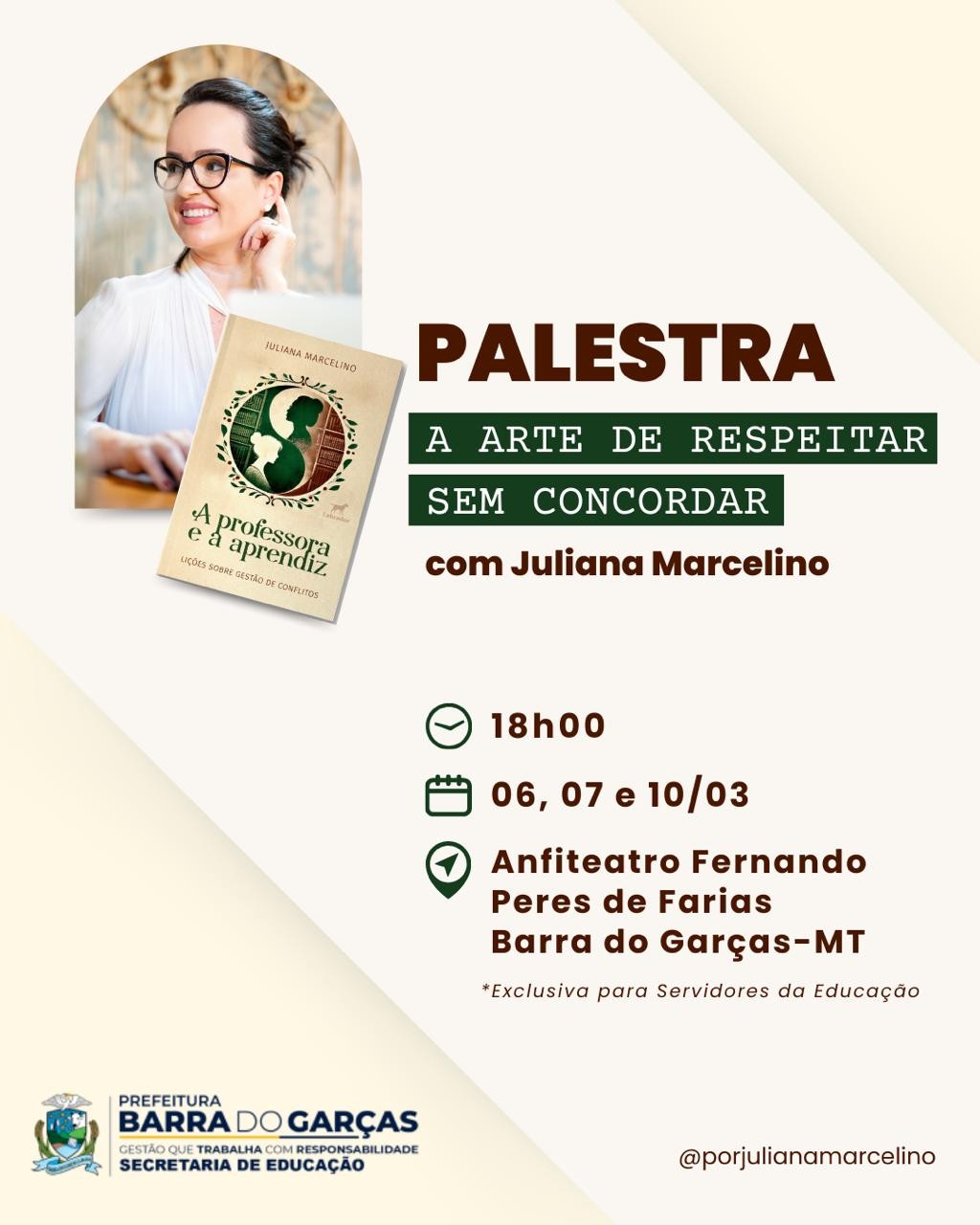 Dando início ao ciclo de formações continuadas de 2025 na rede municipal de ensino de Barra do Garças, a Secretaria de Educação, Esportes e Lazer promoverá, nos dias 6, 7 e 10 de março, a palestra “A Arte de Respeitar sem Concordar”, que será ministrada pela escritora e especialista em gestão de conflitos, Juliana Marcelino. A palestra será ministrada no Anfiteatro Fernando Peres de Farias, às 18h, na abertura das formações.