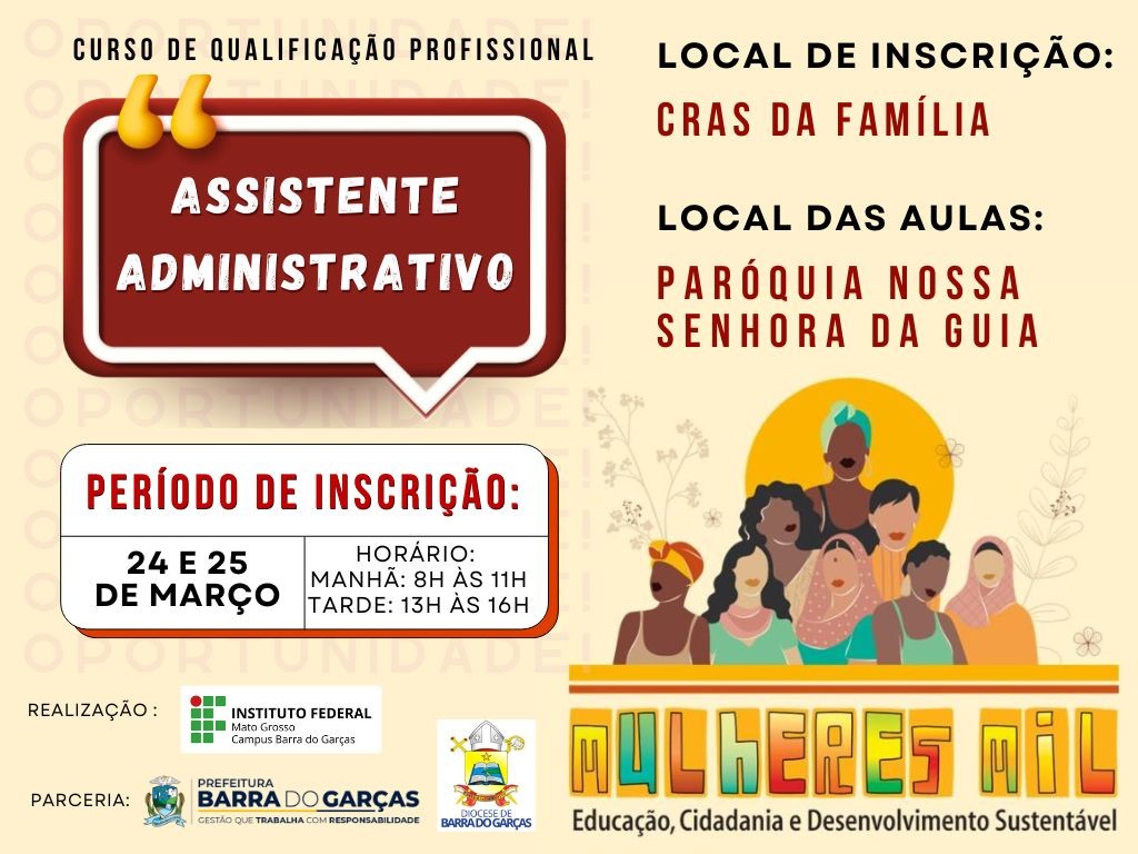 Em parceria com a Prefeitura de Barra do Garças, por meio da Secretaria Municipal de Inclusão e Assistência Social, o Instituto Federal de Mato Grosso (IFMT - Campus Barra do Garças) está com inscrições abertas para o curso de Assistente Administrativo, através do Programa “Mulheres Mil”. O curso é voltado para a capacitação profissional de mulheres em situação de vulnerabilidade social e as inscrições vão até amanhã (25).