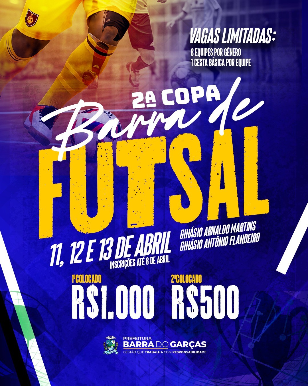 Nos dias 11, 12 e 13 de abril, a Prefeitura de Barra do Garças, através da Secretaria Municipal de Educação, Esportes e Lazer, realizará a 2ª edição da Copa Barra de Futsal. As inscrições para participar do campeonato já estão abertas e vão até o dia 8 de abril.