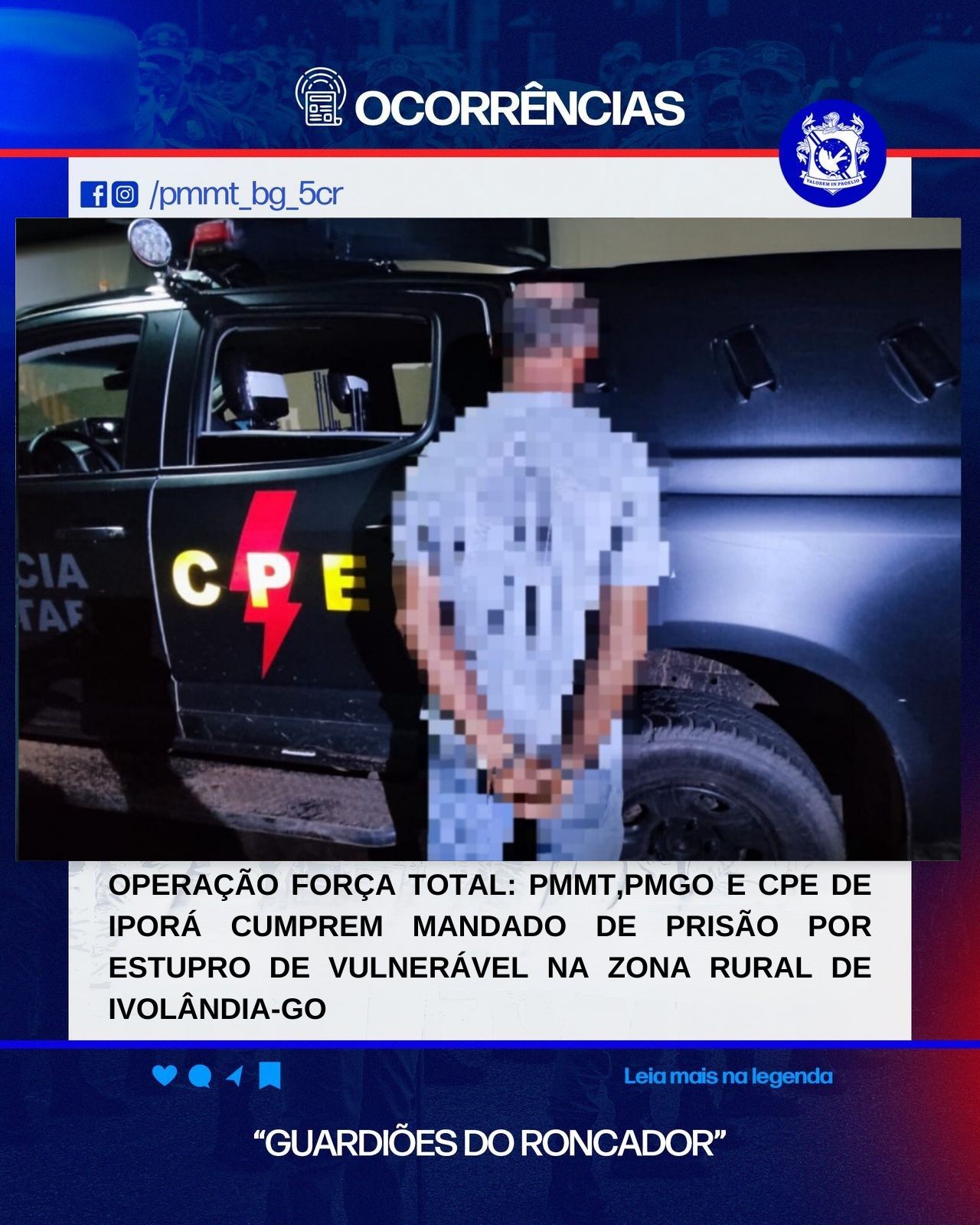 OPERAÇÃO FORÇA TOTAL:PMMT,PMGO E CPE DE IPORÁ CUMPREM MANDADO DE PRISÃO POR ESTUPRO DE VULNERÁVEL NA ZONA RURAL DE IVOLÂNDIA-GO