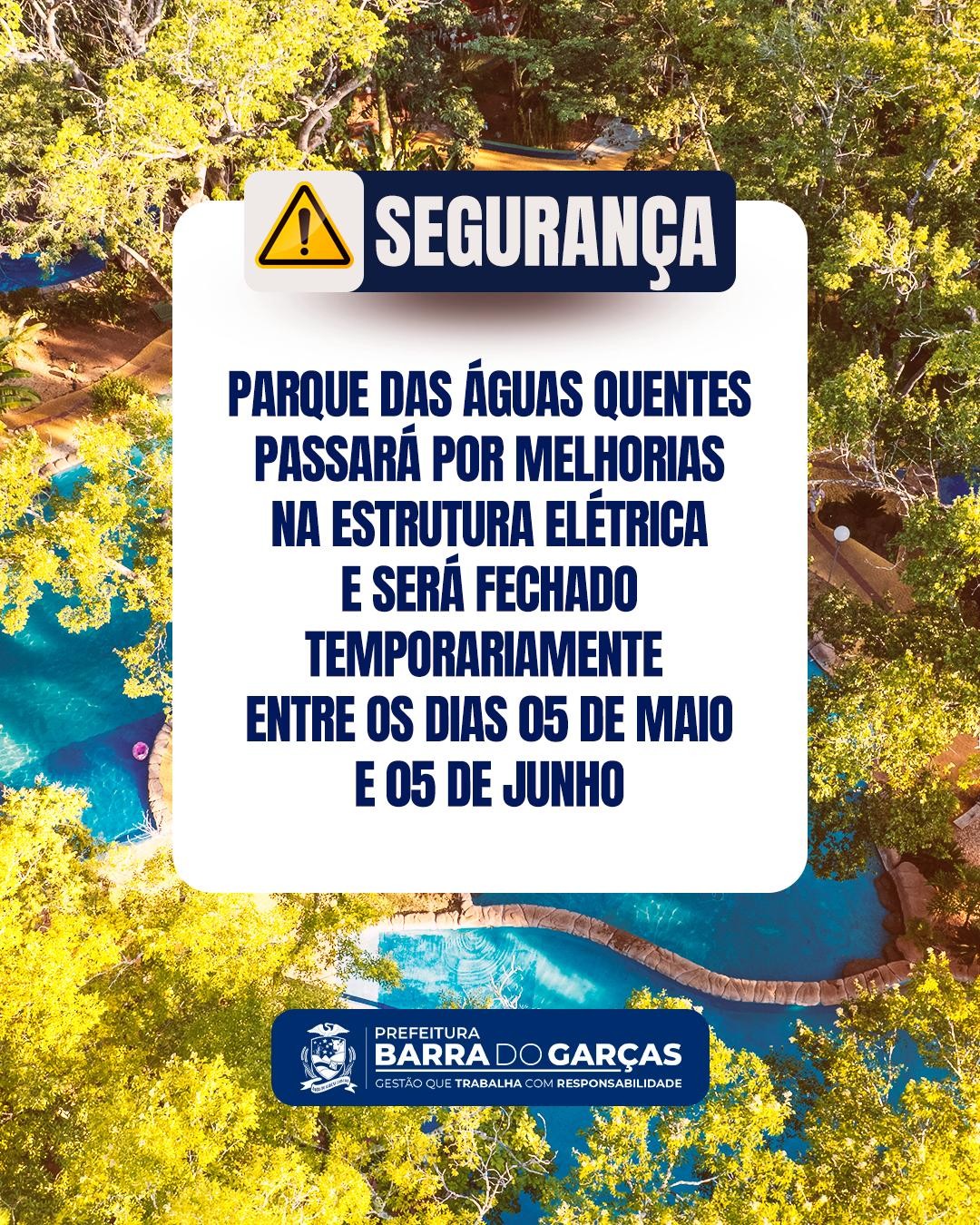 A Prefeitura Municipal de Barra do Garças, por meio da Secretaria de Turismo, informa que o Parque das Águas Quentes estará temporariamente fechado para visitação entre os dias 05 de maio a 5 de junho, para melhorias estruturais.
