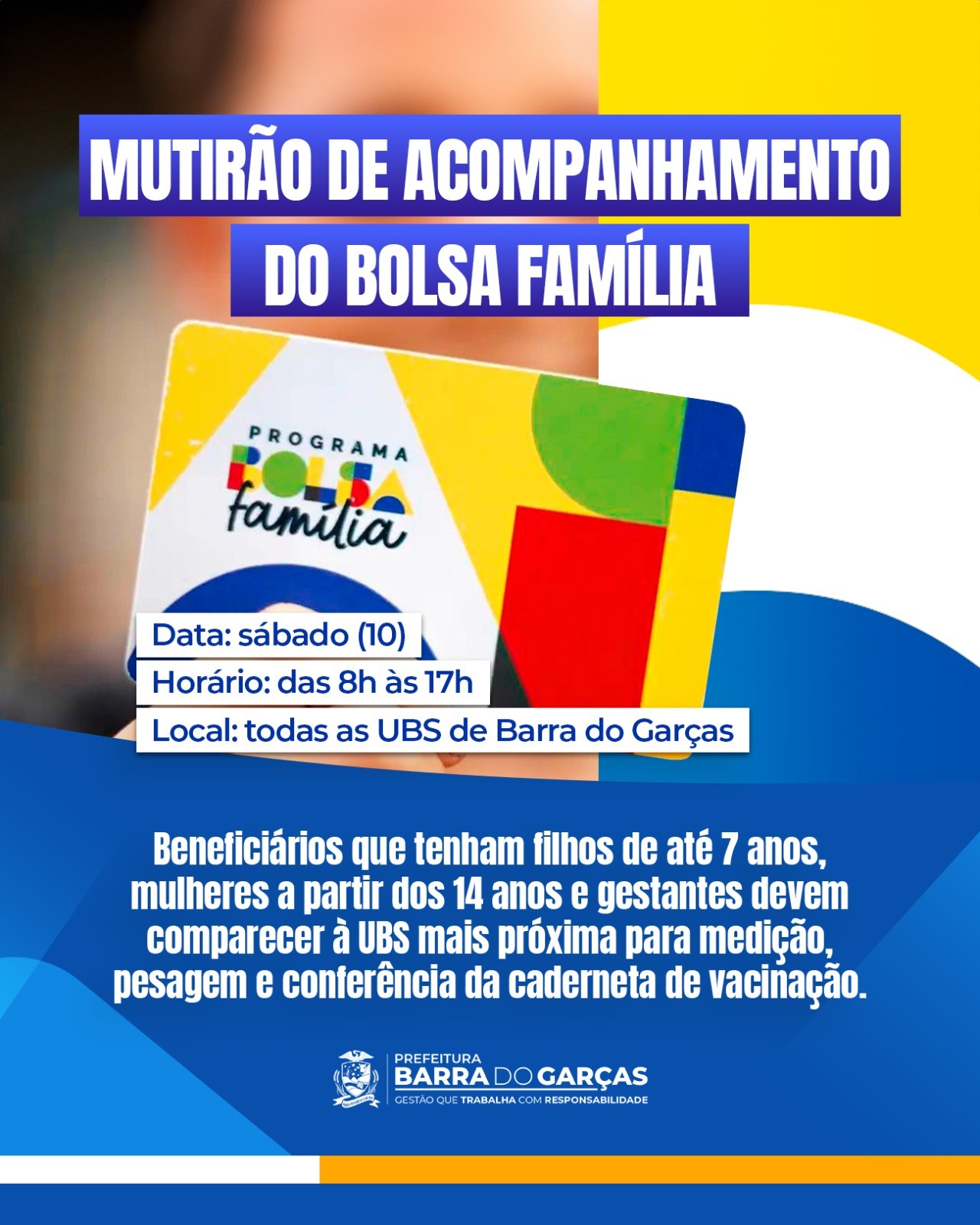 A Prefeitura de Barra do Garças, por meio da Secretaria de Inclusão e Assistência Social, realizará o Mutirão de Acompanhamento do Programa Bolsa Família, neste sábado (10), das 8h às 17h, em todas as Unidades Básicas de Saúde (UBS). As famílias beneficiárias do Bolsa Família são convocadas para medição, pesagem e conferência da caderneta de vacinação das crianças, condicionalidades fundamentais para que o benefício seja continuado.
